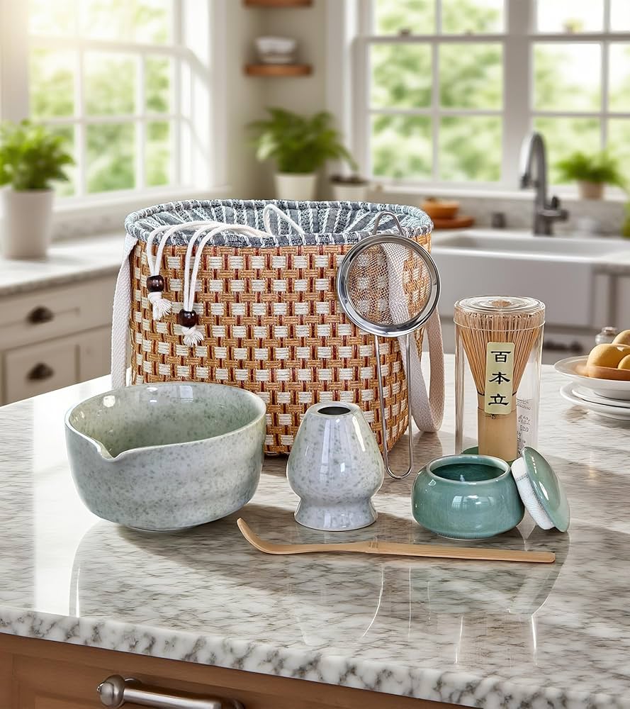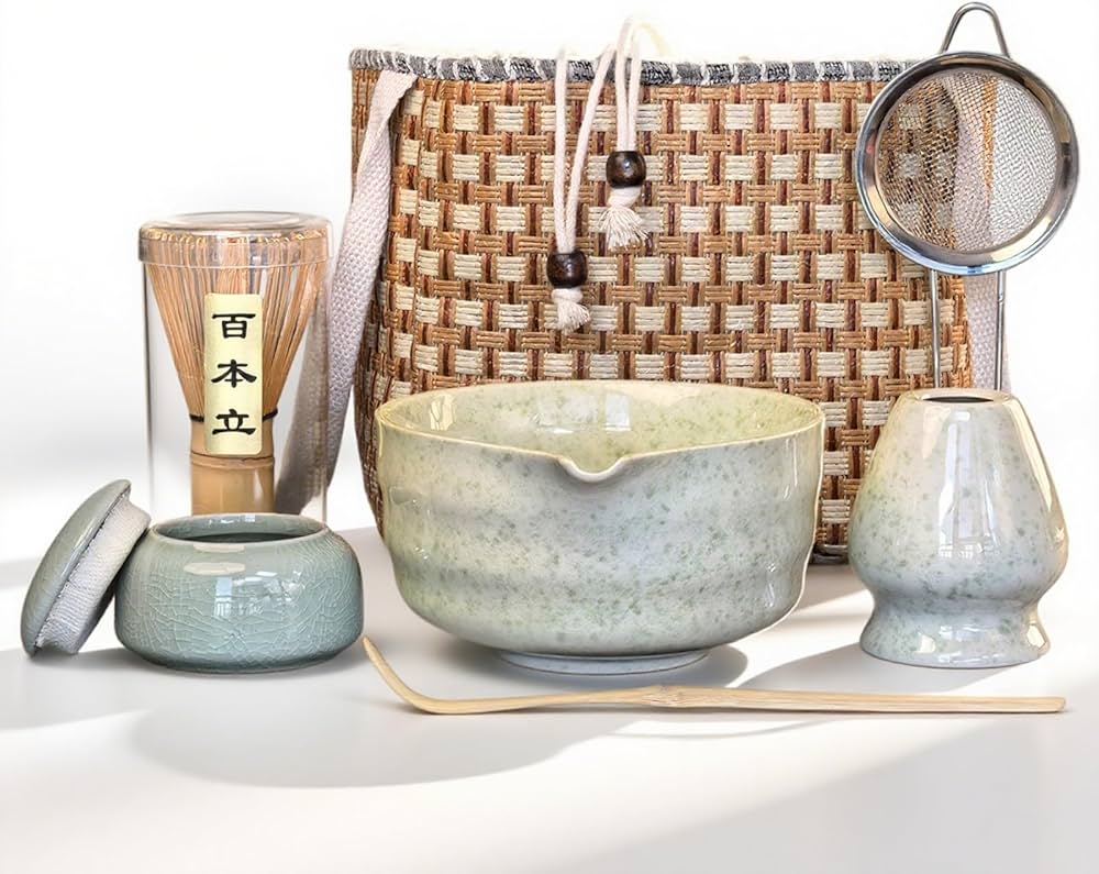 Juego completo de té Matcha (7 piezas) con cesta portátil.