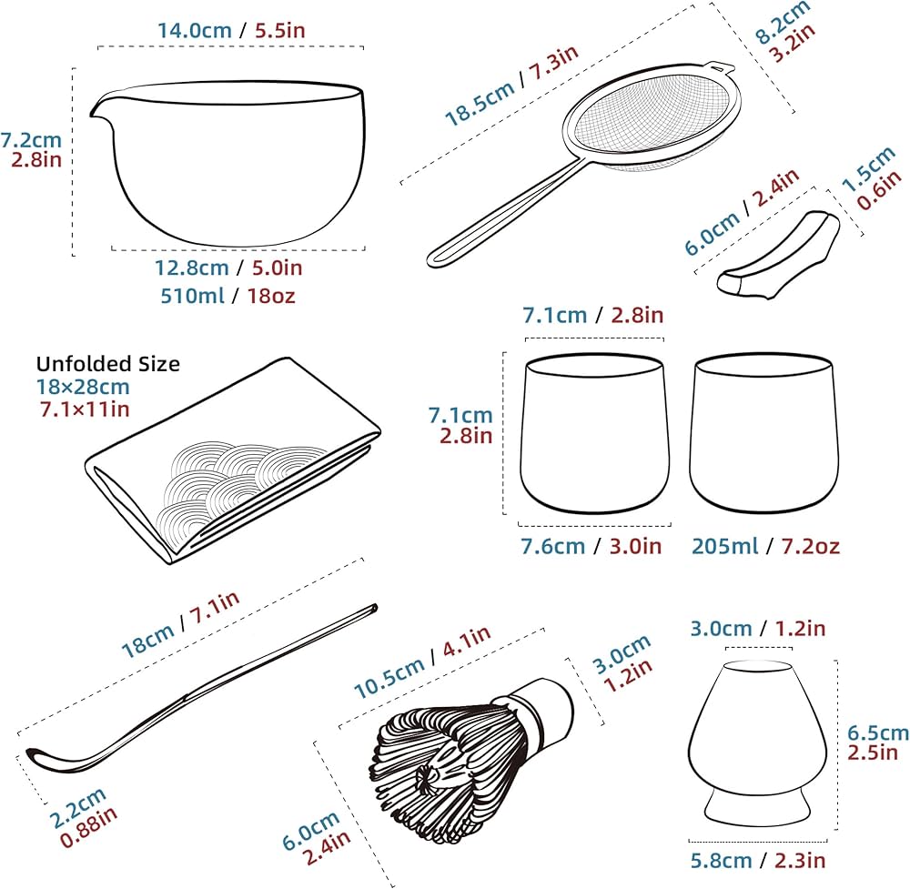 Contiene:1 batidor de bambú, 1 cuchara de bambú (Chashaku), 1 cuenco de cerámica con boquilla de vertido (Chawan) 17.2 fl oz/18 oz, 1* soporte para batidor de Cerámica, 1 soporte de cerámica para cucharita, 1 paño de té de algodón (chakin), 1 tamiz de polvo matcha, 2 vasos pequeños (7.2oz).